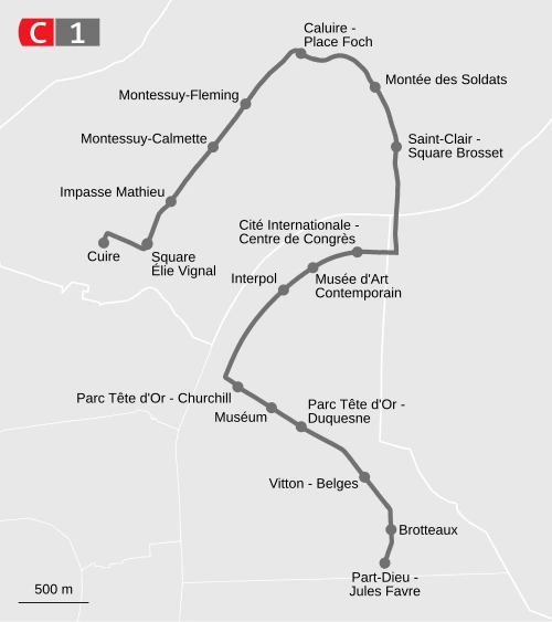 Au-delà de la Part‑Dieu, la C1 remonte progressivement vers Caluire‑et‑Cuire en desservant les quartiers résidentiels de Montessuy, avant de rejoindre son terminus à Cuire, en correspondance avec le métro C. Ce prolongement renforce l’accessibilité de la commune tout en offrant une liaison directe vers le centre de Lyon.